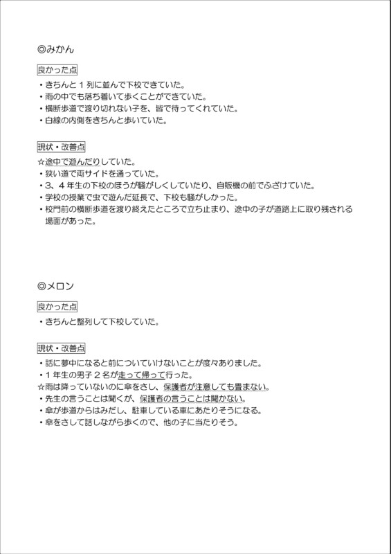 かすがっ子の下校の様子をまとめましたので、お子さんの下校コースの現状をしっかり確認いただき、「交通ルールを守る」「自分の身は自分で守る」ことをご家庭で話し合われてください。
