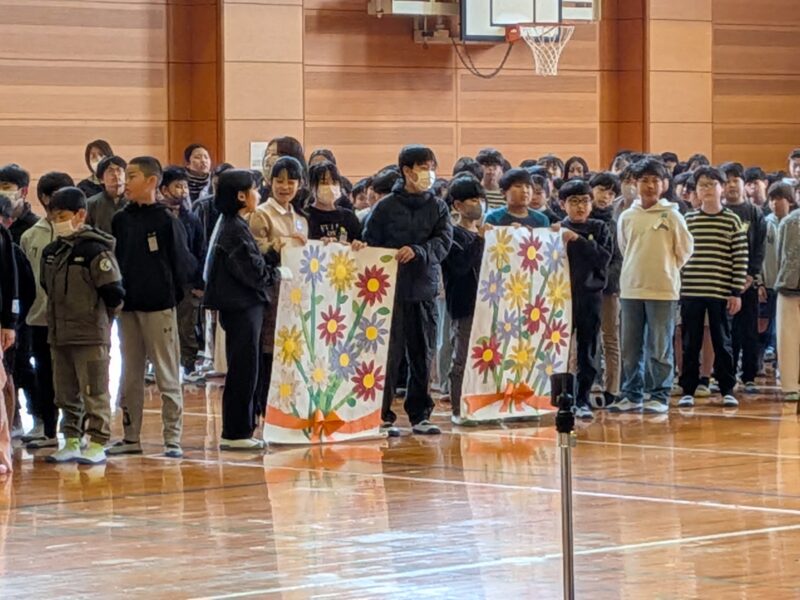 「花びらメッセージ」の紹介では、在校生一人ひとりの思いが形となった掲示物が6年生に贈られました。続く児童会の「カギ渡し」では、6年生から5年生へと“伝統のカギ”が確かに受け継がれ、学校の未来につながる印象深い場面となりました。